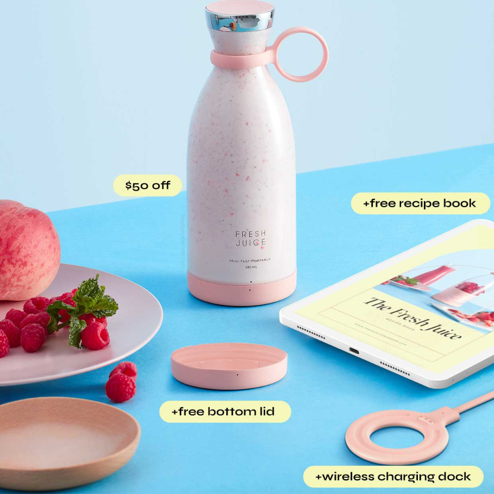 The MASHY™ blender is powerful enough to crush ice, and small enough to be taken on the go. With a minimalistic design, Fresh Juice has a convenient bottle format so that you can drink straight from the blender. It also has a wireless charging dock so you can charge it without having to worry about wires!⚡